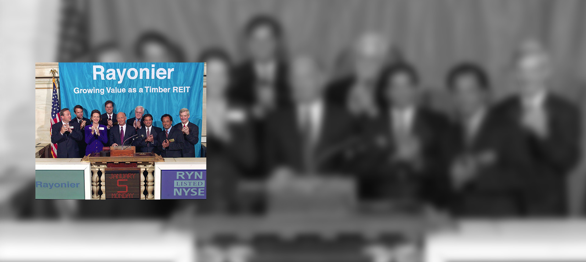 After the ITT spin-off, Rayonier stock trading begins on the New York Stock Exchange under the symbol RYN in 1994.