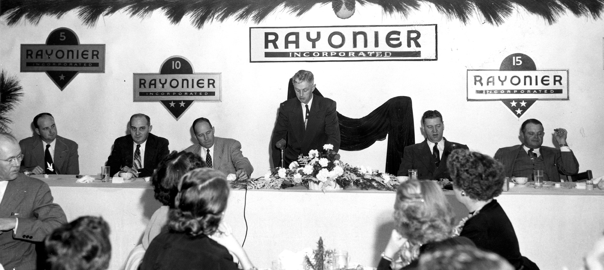 We call the pulp “Rayonier,” a name created from the words rayon and Mount Rainier, which is visible from our Shelton mill and research center. Soon after, we rename ourselves Rayonier.